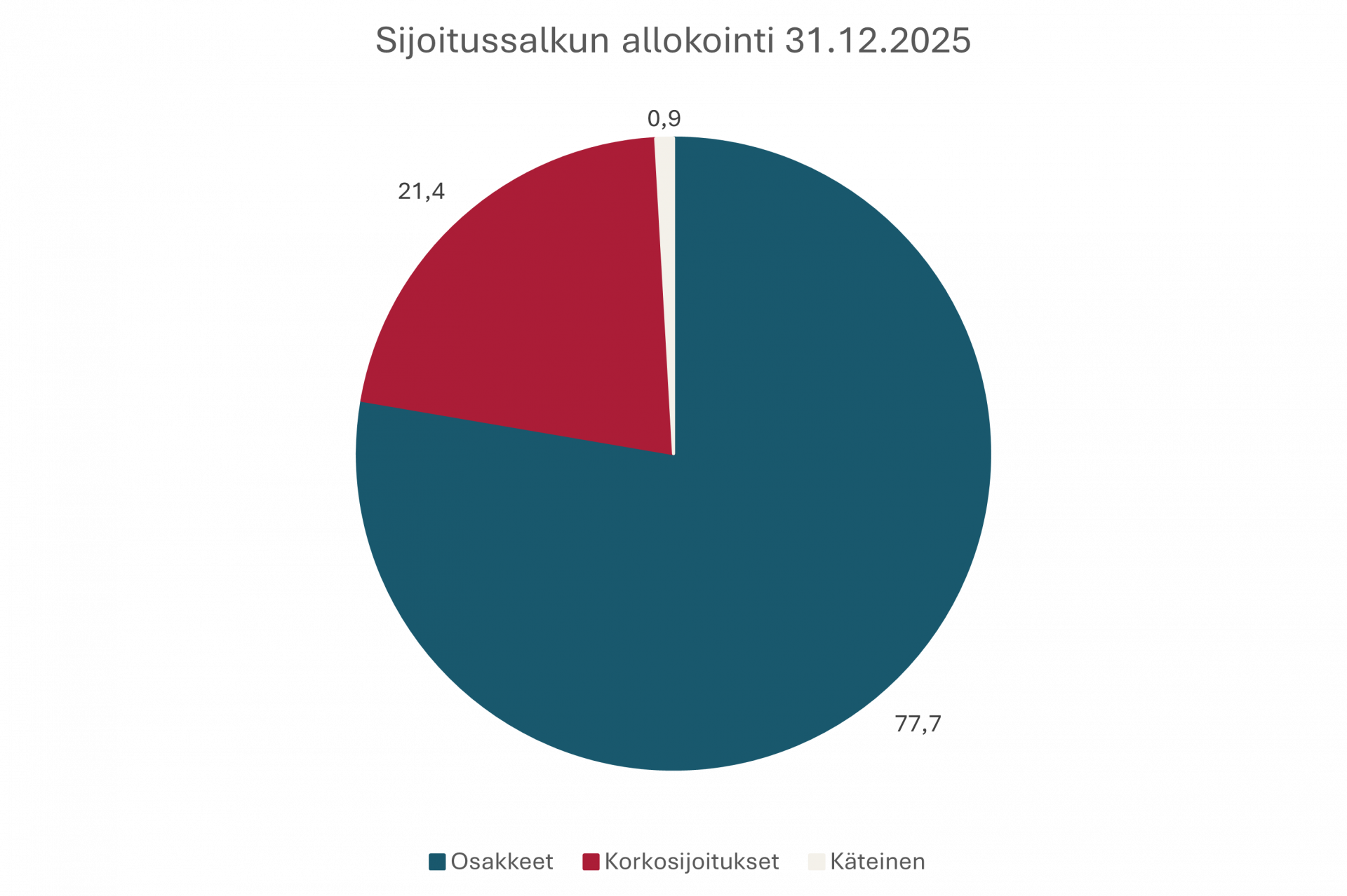 31.12.2025 sijoitussalkun markkina-arvo oli reilu 15,1 MEUR ja allokointi allaolevan kuvan mukainen.