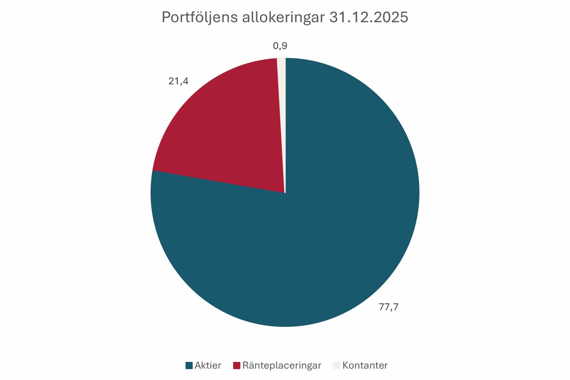31.12.2025 var placeringsportföljens marknadsvärde dryga 15,1 MEUR och allokeringen enligt grafen nedan.